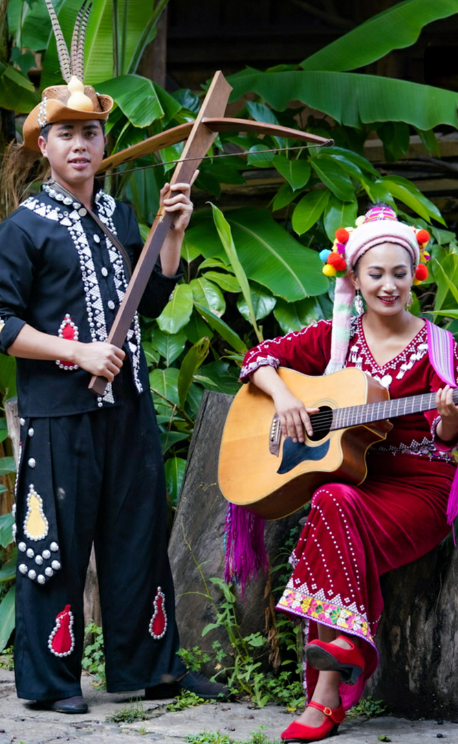 德昂族人口約1.7萬,主要分布在德宏州和保山市的潞西、梁河、瑞麗、隴川、隆陽等縣區(qū)。民居多為草排覆頂竹木結(jié)構的干欄式建筑,眼前的德昂村建筑納入了能容納數(shù)十人居住的德昂大房子,氈帽頂?shù)男》孔樱€有頗具浪漫色彩的大公房、小公房……還建有“龍陽塔”標志及佛教奘房、佛塔。德昂族民間普遍信奉南傳佛教,民俗活動與佛事活動關聯(lián)緊密。潑水節(jié)、開門節(jié)、關門節(jié)是重大節(jié)日。德昂族服飾色彩豐富,口頭文學特別是民歌創(chuàng)作活動...