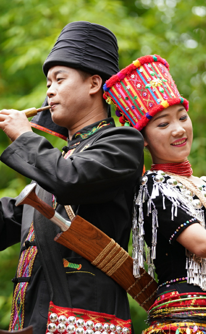 拉祜族人口約41萬,主要聚居在思茅、臨滄境內(nèi)的瀾滄江沿岸地區(qū)。拉祜族寨與基諾族寨緊緊毗連,寨內(nèi)建有拉祜族茅草房、大公房、教堂、牛棚以及葫蘆廣場。位于拉祜族寨中心位置的葫蘆廣場形似一只碩大的葫蘆平面,核心有一組石雕葫蘆。傳說拉祜族的祖先誕生于葫蘆中,因此葫蘆廣場表現(xiàn)了拉祜族的祖先崇拜觀念。漫步拉祜族寨,葫蘆笙悠揚婉轉(zhuǎn)、口弦聲余音繞梁,表現(xiàn)拉祜族勞動場面的“豐收擺舞”充滿歡騰和激情,展示了拉祜族的民間...